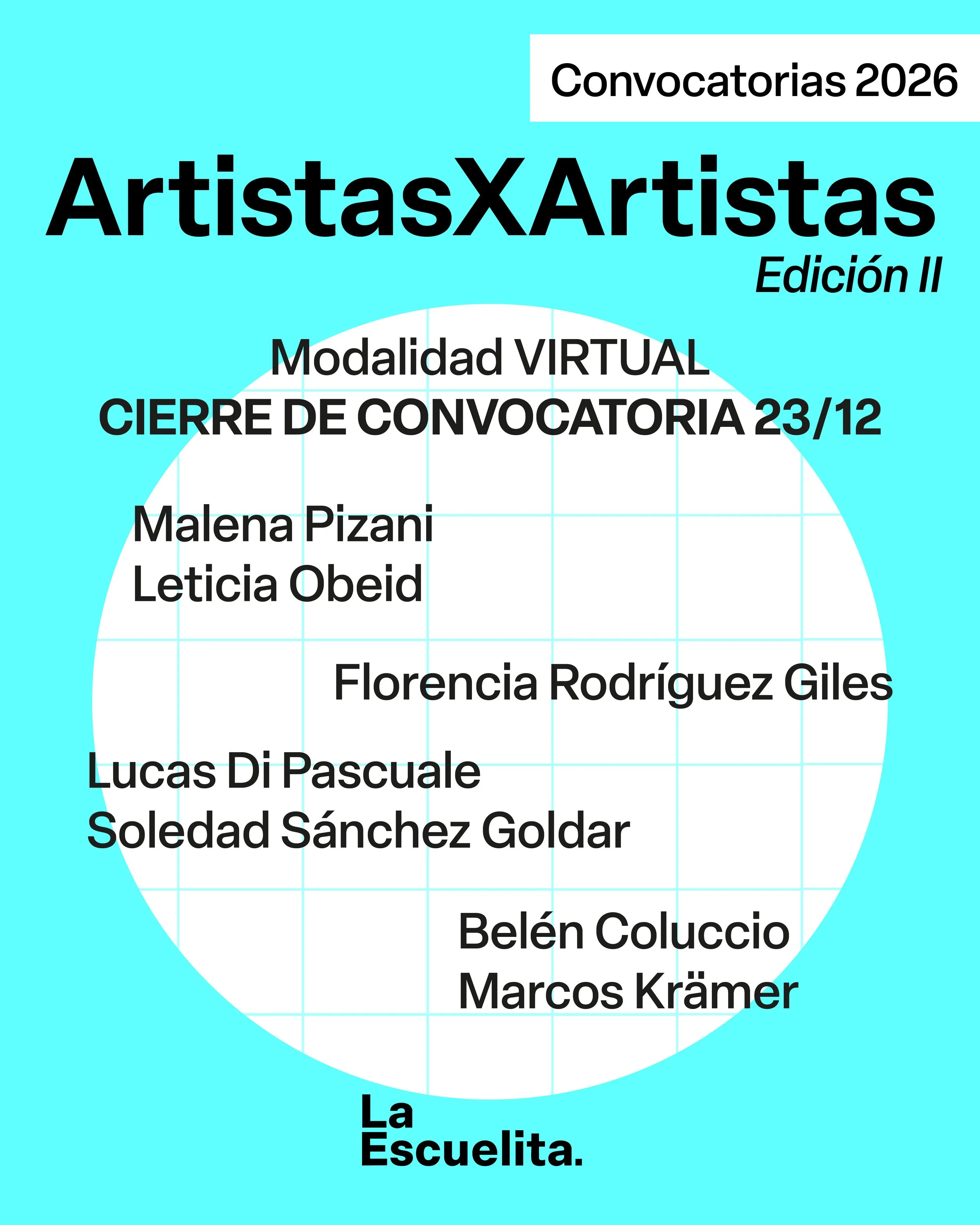 Artistas x Artistas es un programa de formación coordinado por Fundación El Mirador y dirigido a artistas de todo el país (excepto quienes vivan en CABA) y de todo el mundo que quieran atravesar durante nueve meses una experiencia intensiva y grupal de análisis de obra, de taller, de materiales y visualidades y de puesta en diálogo común de sus poéticas y procesos de trabajo con un equipo docente diseñado para tal fin.